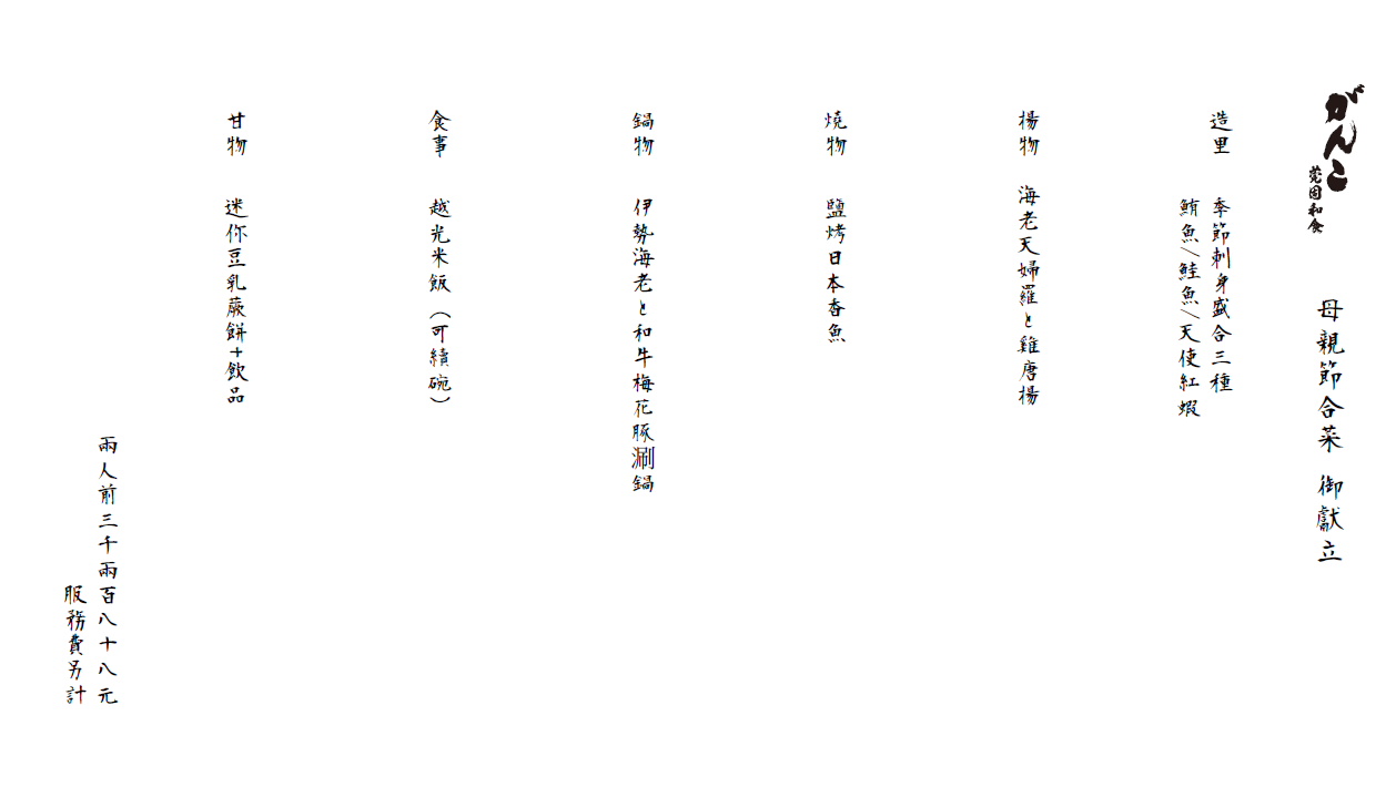Ganko2026-04-14 16:40:452026-04-14 16:57:522026 母親節限定會席料理 4/28-5/18 【桃園中壢店】